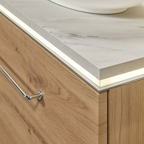Die stilvolle 2morrow Platte Slim-Light mit indirekter Beleuchtung verleiht auch massiven Unterschränken befreiende Leichtigkeit.